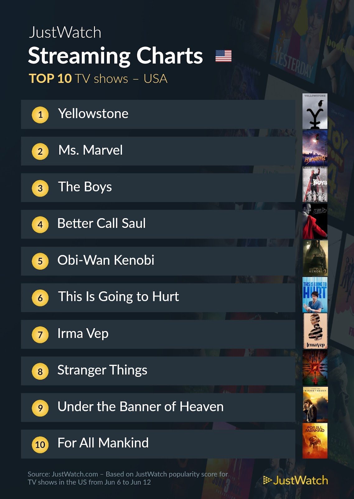Other shows in the chart include Netflix smash-hit Better Call Saul, new Disney+ show Ms. Marvel, and the ever-popular Stranger Things.