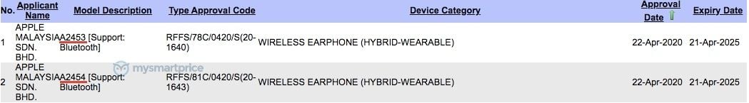 Today, we have spotted the listing of the same, Apple A2453 and A2454 truly wireless earphones on Malaysia's SIRIM (Standard and Industrial Research Institute of Malaysia) as they have been certified through the agency. As you can see in the screenshot above, the listing of these earphones, unfortunately, doesn't reveal any other information apart from their model numbers.