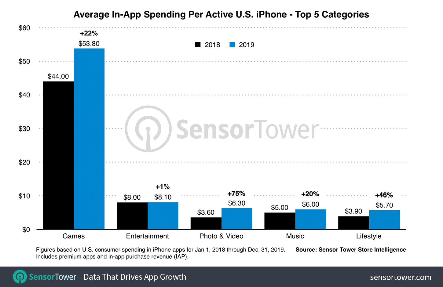 In-app spending per U.S. iPhone grew 27 percent year-over-year in 2019, compared to 36 percent between 2017 and 2018, owing to continued market maturation and growing saturation of smartphone ownership among consumers. This Y/Y growth was considerable nonetheless, and speaks to the sustained health of the iOS ecosystem in the U.S. where spending continues to increase at a rate outpacing adoption of devices by first-time users.