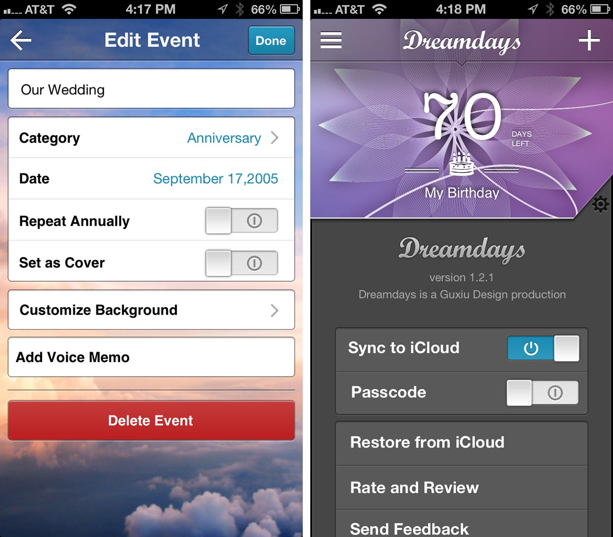 Dreamdays is an iPhone app that helps you countdown to the days that matter, like birthdays, holidays, anniversaries, or any other dates that are important to you. It features a beautiful design and customizable backgrounds for each event.