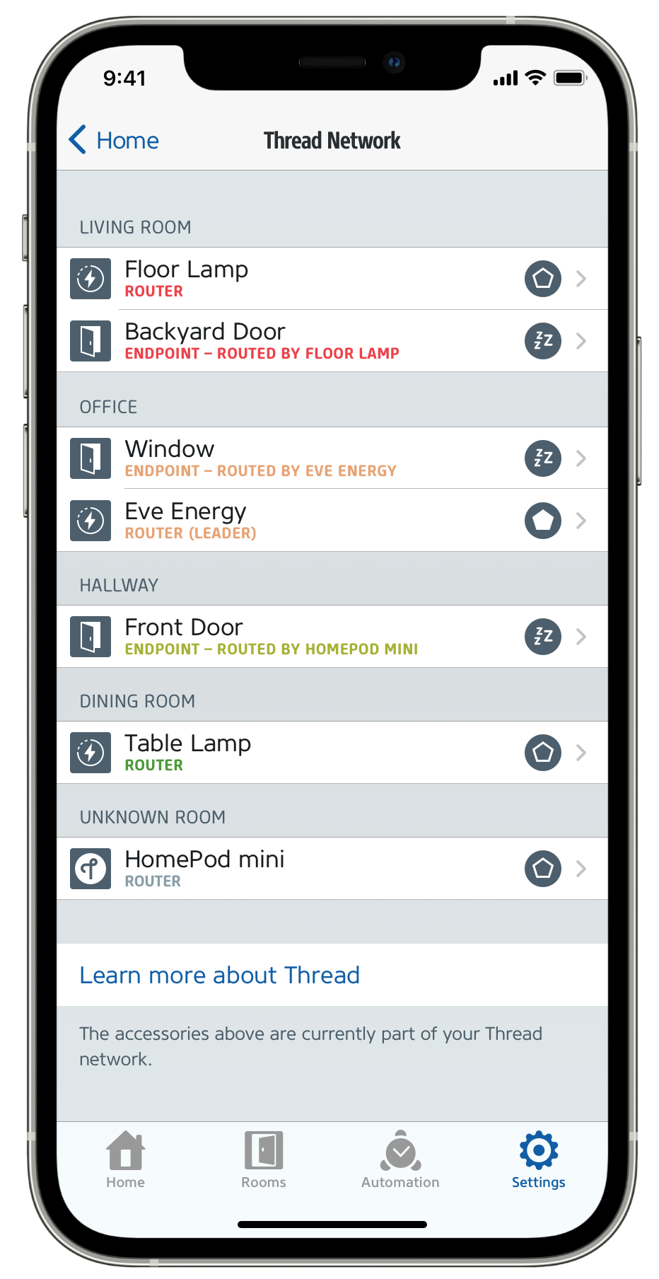 To take advantage of Thread capabilities in the Eve Aqua, a HomePod mini — which acts as a Border Router, must be present in the home. After installing the firmware update, the Eve Aqua will automatically switch to Thread in the background without any additional steps by the user. Users can confirm that the Eve Aqua is utilizing Thread via the Eve for HomeKit app, which provides a breakdown of connection quality and routes of all of the home's active Thread devices.