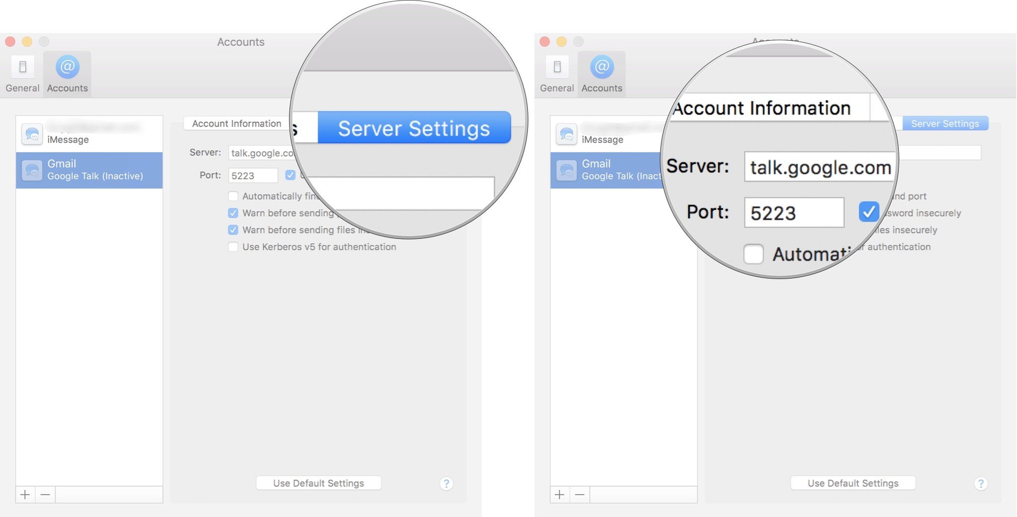- Change the Server name to talk.google.com. (Make sure this is set to talk.google.com. By default it will just be google.com).