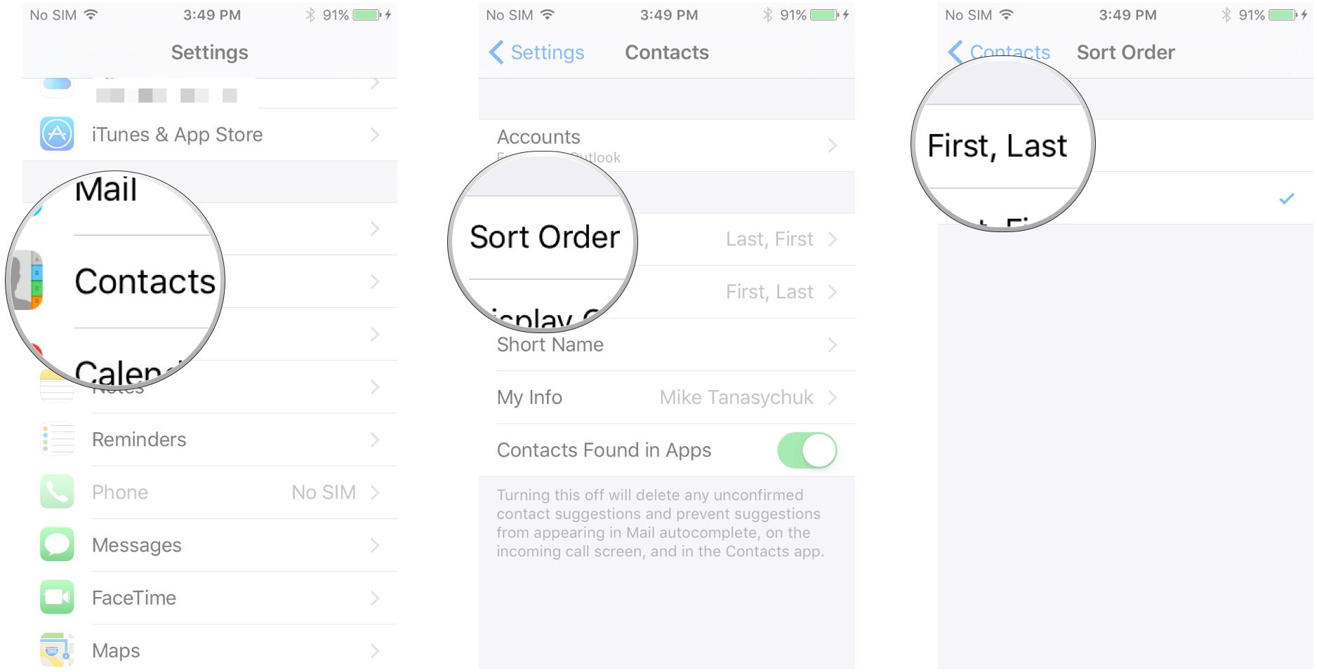 - Tap on First, Last or Last, First depending on the way you want contacts sorted in your Contacts list.