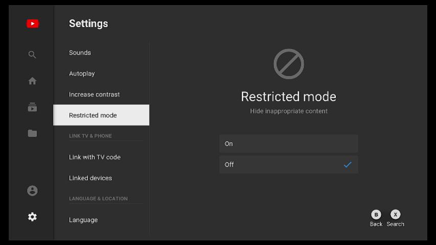 - Select the On option and press A to enable restricted mode.