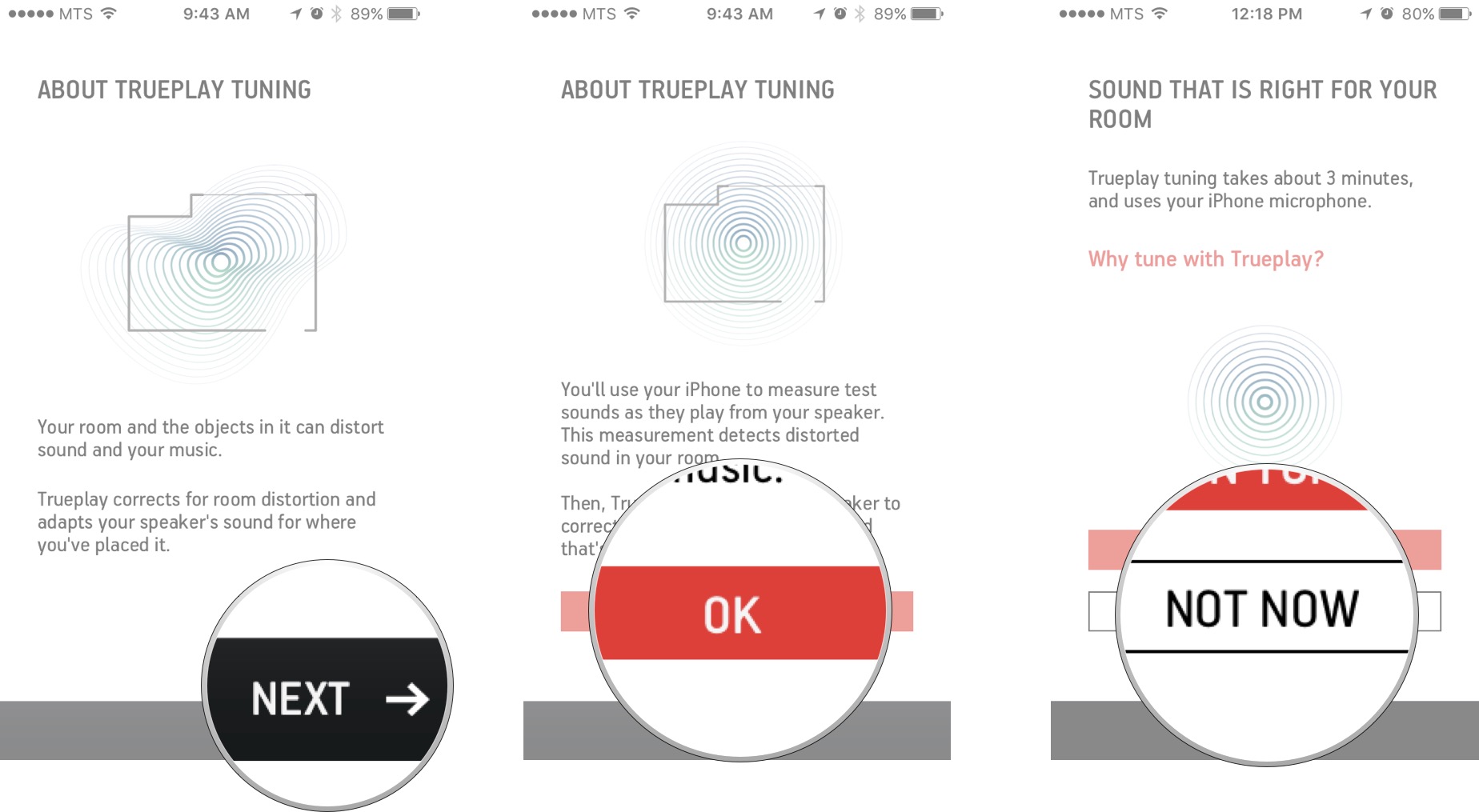 - Tap Continue to use Sonos's Trueplay tuning process.Note: Only certain phones support Trueplay; if your device doesn't support it, you'll see an error and an OK dialogue; you can set up Trueplay later at any point with a compatible device.