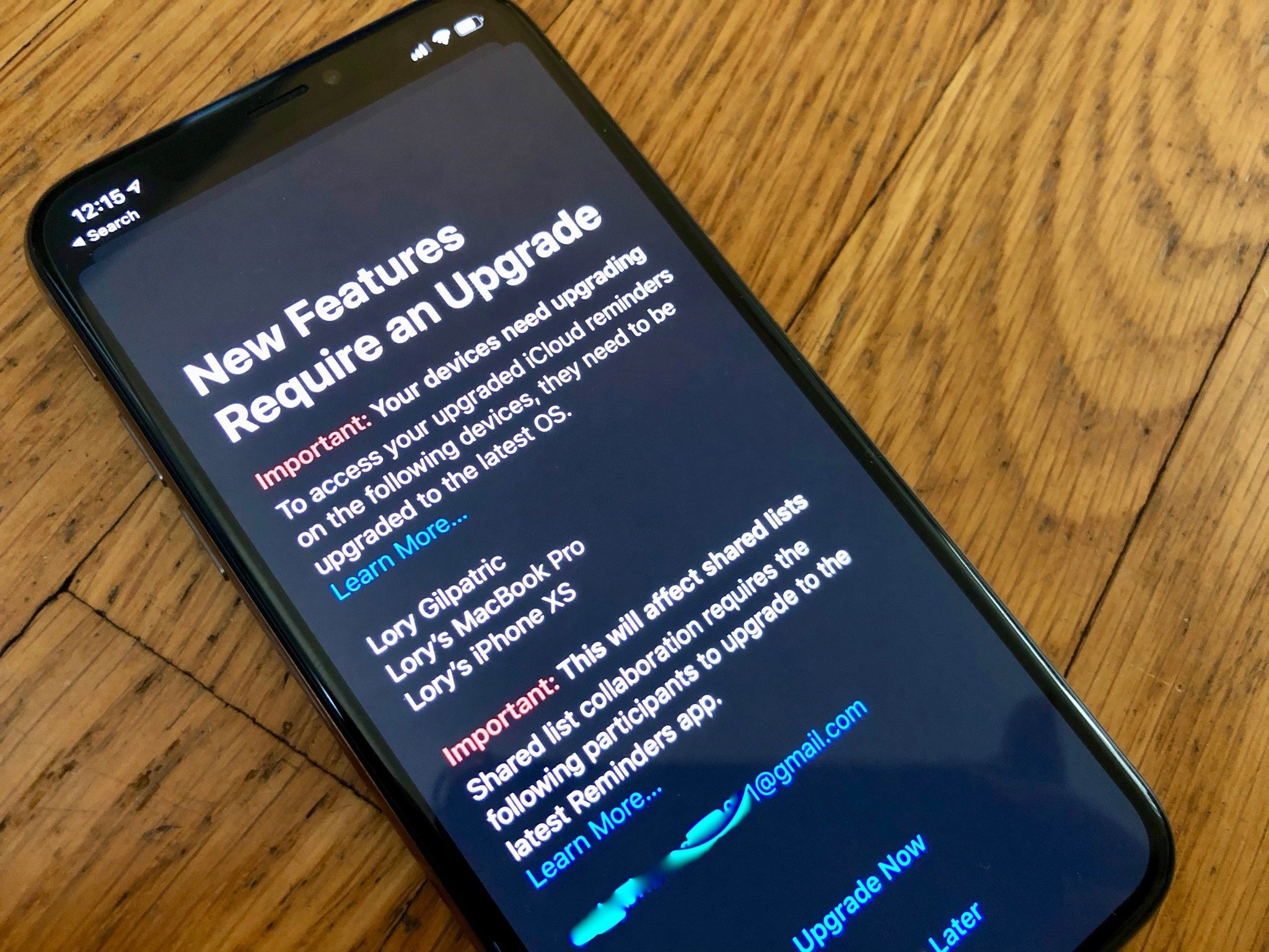 The first time you open the Reminders app after installing iOS 13, you'll see a notice that some of your devices need to be updated before they can access changes made in Reminders via iCloud. You'll also see a list of the iCloud addresses you share Reminders with that also need to update in order to access any changes you make.