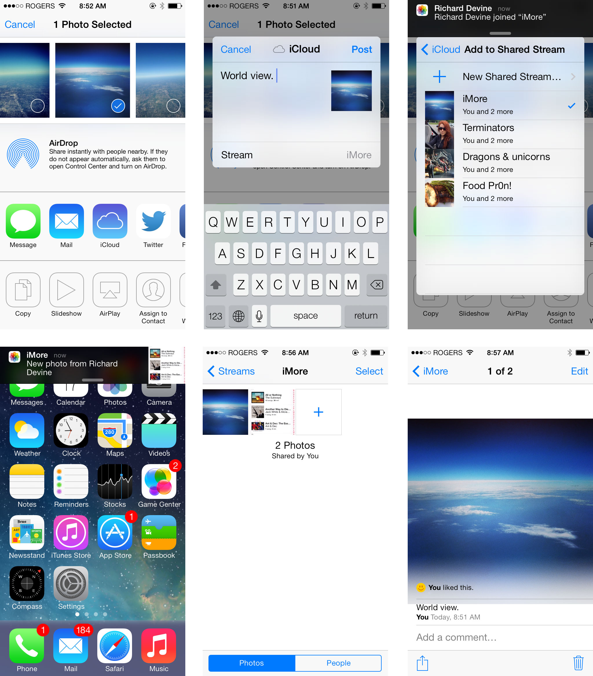 You can add a photo - and now a video as well! - to Shared Photo Stream using the Share Sheet. The sheet itself has been redesigned, of course. No more paperclip renderings needed. You can still add a comment, however. The big difference is that once you've added a photo or album, the people you've shared it with can add additional photos of their own.