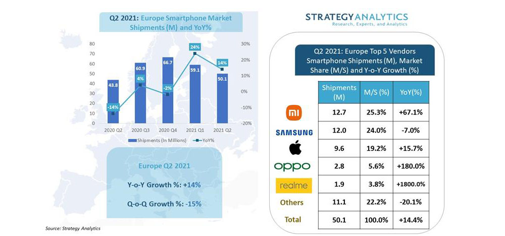 The highlight of the quarter is Xiaomi emerging as Europe's number one vendor by smartphone shipments for the first time ever. We estimate Xiaomi shipped a record 12.7 million units in Europe to overtake long-time leader Samsung.[...]Apple posted a strong quarter, growing +16% YoY and shipping an estimated 9.6M iPhones in Europe during Q2 2021. The iPhone 12 range continues to resonate with loyal Apple fans who were overdue to replace their aging 4G models.