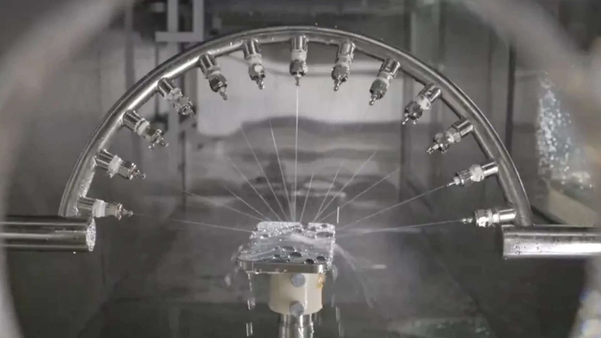 First up, iPhones go through the water ingress test. Imagine your iPhone taking a 360-degree shower with 13 streams of water jetting at it from all angles – yes, like a dishwasher. Apple has a whole room dedicated to just water and dust testing. Not one, not two, but four levels of water testing. From a gentle drip tray simulation to a full-on firehose spray, and then locking the phone underwater with extra pressure to mimic deep-sea adventures. Because, you know, in case you drop your phone while scuba diving.