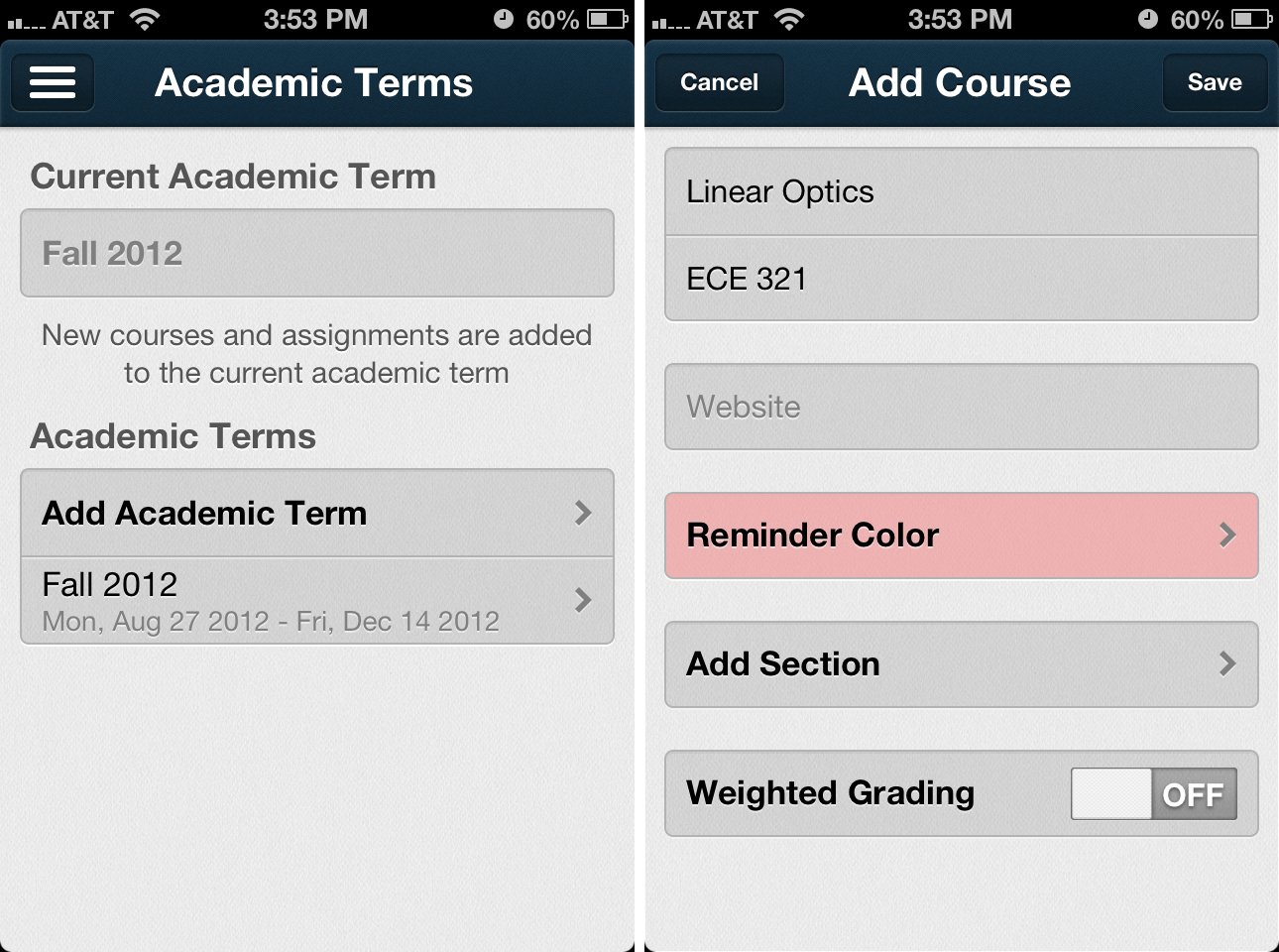 When it comes to adding courses and terms, Erudio is the most complicated due to the need for section numbers. iStudiez Pro and iHomework are very simliar in format but iHomework doesn't have a terms feature. iStudiez Pro offers the best balance between ease of use and feature set when it comes to adding and managing academic terms and individual courses.