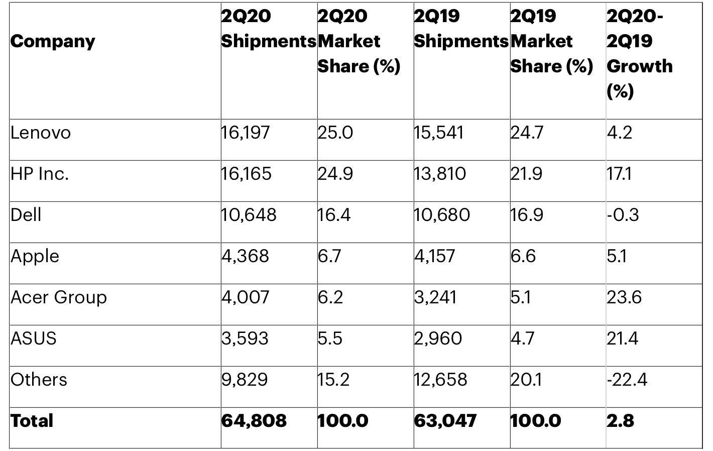 The PC market saw a bump in overall growth in the second quarter of 2020 due to strong mobile demand as well as supply chains recovering from the coronavirus pandemic.