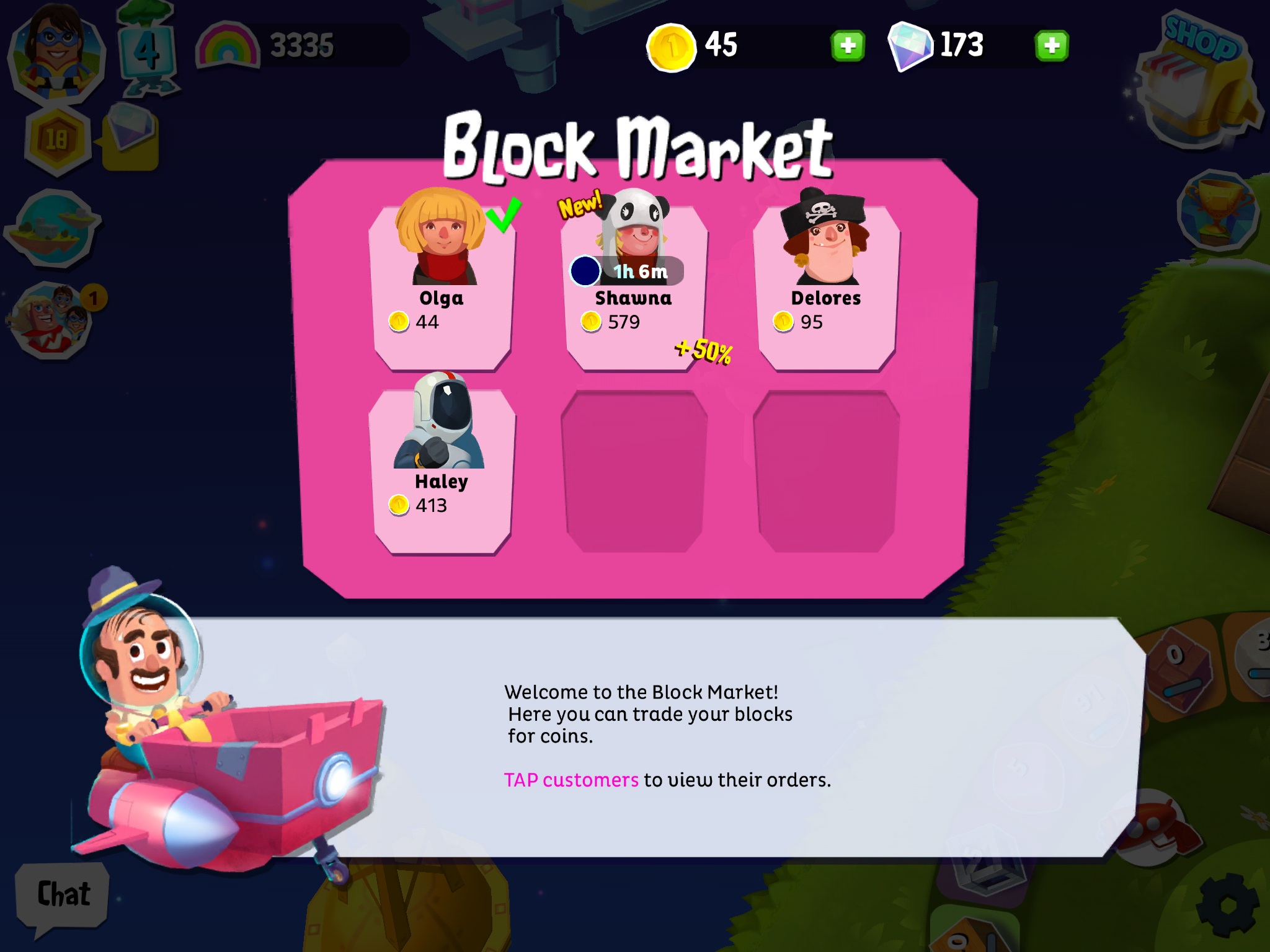 As you add bots to your world, you'll want to keep them producing as often as you can. The more building materials you have, the more valuable you are. You can never have too much of an item, and when you do, that's where the Block Market comes in. Before you quit playing Supernauts, be sure your bots are at max efficiency and the ones that have queues available, fill them.