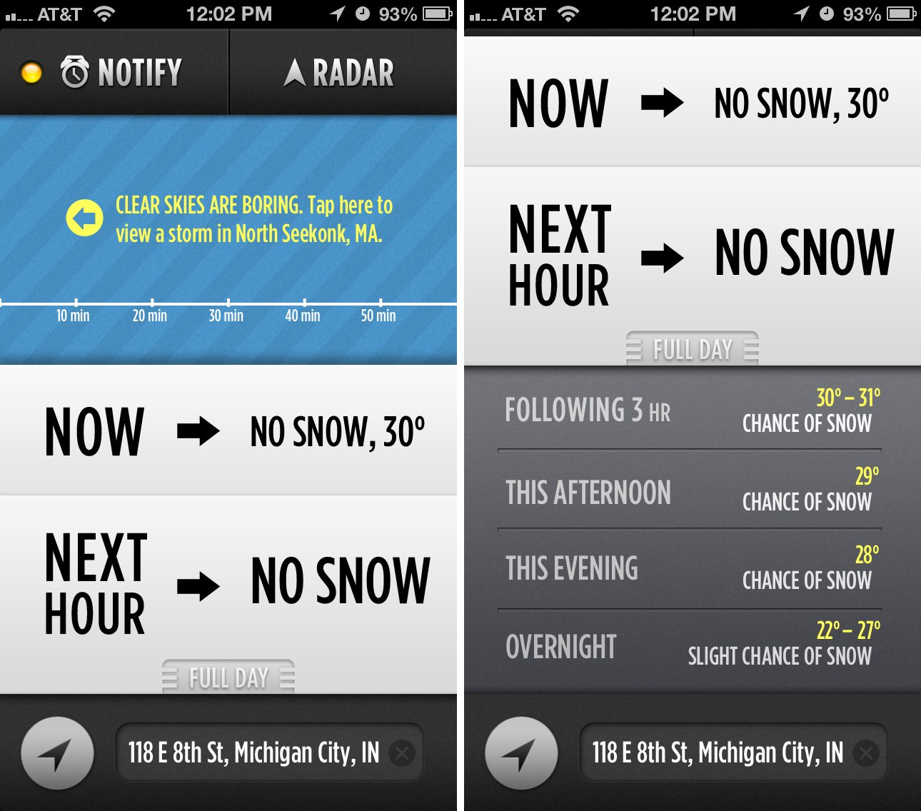 The premise of Dark Sky is to tell you conditions as they are right now and what you can expect over the next hour or so. From the main screen you can easily see what the current condition is and what is expected over the next hour. This information is always readily available to you after launching Dark Sky. The main screen does, however, give you easy access to some other important information such as the forecast for the full day. Just slide up the Full Day tab that sits beneath the information on the next hour and you'll be given a forecast for the entire day. This will include the next 3 hours, an afternoon summary, an evening summary, and an overnight summary. Next to each section you'll see data that includes high/low temperatures and a condition such as rain, snow, or sunny.